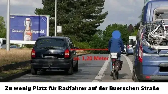 Die bisherige Markierung bleibt erhalten, die neuen Markierungen werden, wie von Baustellen bekannt, in gelber Farbe aufgetragen. Die Bestandsmarkierungen in Weiß und Rot werden dadurch aufgehoben. Die Buersche Straße erhält so während des einjährigen Testzeitraums ein regelkonformes und sicheres Angebot auf einem teilweise räumlich getrennten Radweg. Diese neu gewonnene Sicherheit benötigt Platz: Daher fallen im Bereich der Brücke 130 sowie im weiteren Verlauf zusätzlich 60 Parkplätze weg. Das ist möglich, weil Gladbeck über ein großzügiges Parkplatzangebot in der Innenstadt verfügt. (Ha-Ha-Ha: die Redaktion)