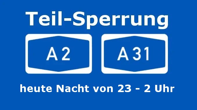 10.01.2024 – A2-A31 – Im Dreieck Bottrop muss ein Schwertransport die Verbindung von der A2 in Fahrtrichtung Oberhausen auf die A31 in Fahrtrichtung Emden befahren. Deswegen sperrt die Autobahn Westfalen in der Nacht von Mittwoch (10.01.) auf Donnerstag (11.01.) im Zeitraum von 23 bis 2 Uhr für die Dauer von etwa anderthalb Stunden diese Verbindung.