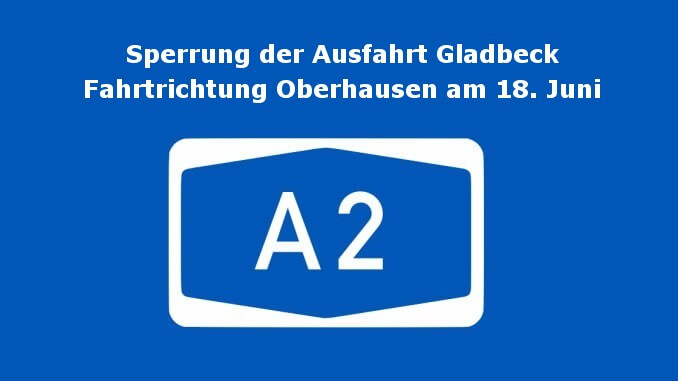 14.06.2023 – A2 – Die Autobahn Westfalen setzt eine Lärmschutzwand in der Anschlussstelle Essen/Gladbeck an der A2 instand. Deswegen wird die Ausfahrt der Anschlussstelle am Sonntag (18.6.) von 5 bis 22 Uhr in Fahrtrichtung Oberhausen gesperrt. Die Umleitung führt mit dem Roten Punkt über die Anschlussstelle Gladbeck-Ellinghorst. Einsatz- und Rettungsfahrzeuge können die Ausfahrt auch während der Arbeiten nutzen.