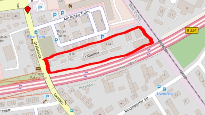 Gekauft hat die Stadt u.a. das riesige Grundstück eines ehemaligen Ratsherrn der Grünen. Der hatte sich mit seinem Lebensgefährten (auch Grünen-Ratsherr) lange Jahre für den Ausbau der B224 eingesetzt. Ganz im Gegensatz zu den Grünen in den umliegenden Städten. Es handelt sich um die Fläche zwischen Grabenstraße und Bahnlinie, sowie Roter Turm und B224. (siehe Lageplan oben) Dort stehen mehrere Wohnhäuser und jede Menge Garagen.