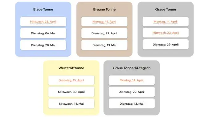 Alle Abfuhrtage verschieben sich dabei nach vorne. So findet die Leerung für Montag, den 14. April, bereits am Samstag, 12. April, statt. Der Dienstagsbezirk wird schon am Montag abgefahren, der Mittwochsbezirk am Dienstag – und so weiter. Diese vorgezogenen Termine gelten für die gesamte Karwoche bis einschließlich Donnerstag, 17. April.