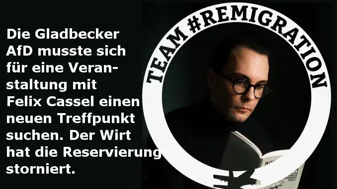 18.04.2024 – AfD ausgeladen – Das „Gladbecker Bündnis für Courage“ hatte für Mittwoch, den 17. April zu einer spontanen Demo aufgerufen. „Leider haben wir erst heute erfahren, wo die Veranstaltung der AfD Gladbeck mit dem Vorsitzenden der „Jungen Alternativen“ NRW, Felix Cassel stattfindet“, heißt es in dem Aufruf von Roger Kreft.