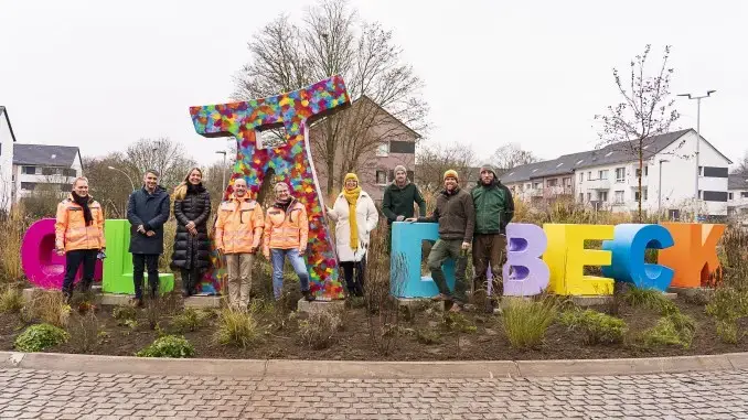 08.12.2023 – „Alwinchen“ – Der Hingucker am neuen Kreisverkehr ist da: Bürgermeisterin Bettina Weist und Künstlerin Susanne Schalz haben am Freitagvormittag gemeinsam den neuen Gladbeck-Schriftzug mit dem drei Meter hohen „Alwinchen“ enthüllt.