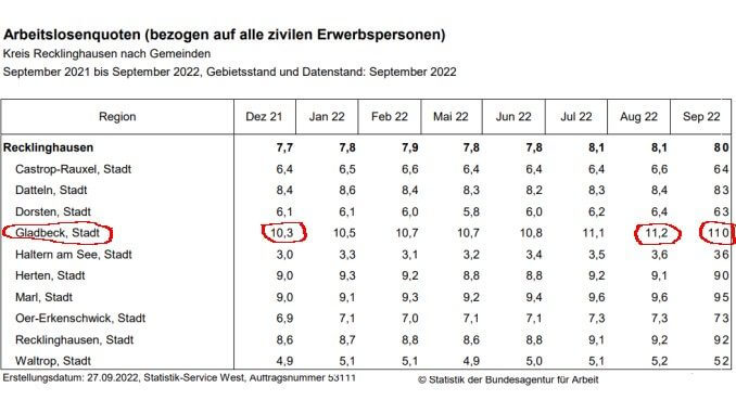 03.10.2022 – Arbeitsmarkt – Die Arbeitsverwaltung jubelt mal wieder. Die Arbeitslosenquote ist in Gladbeck von 11,2 % (im August) auf 11 % (im September) gesunken. Kein Wort darüber, dass sie noch im Dez. 21 in Gladbeck bei 10,3 % lag. Über alle 10 Städte des Kreises gerechnet, liegt die Quote bei derzeit 8 %. Gladbeck liegt also 3 % über dem Schnitt. Die zweithöchste Quote (nach Gladbeck) verzeichnet Marl, mit 9,5 % und das positive Schlusslicht ist Haltern am See mit 3,6 %.