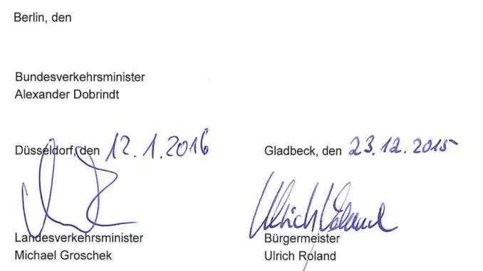 Schon Bürgermeister Roland hatte behauptet, dass es ein „endverhandeltes Eckpunktepapier“ zur A52 zwischen Bund, Land NRW und der Stadt Gladbeck geben würde, in der ein Tunnel durch Gladbeck vereinbart sei. Dieses Papier wurde zwar vom damaligen Landesverkehrsminister Michael Groschek (SPD) und dem Gladbecker Bürgermeister Ulrich Roland (SPD) unterschrieben, aber nicht (wie behauptet) vom Bundesverkehrsminister Alexander Dobrindt (CDU). Das nur zum Teil unterschriebene Dokument steht auf der Webseite der Stadt Gladbeck! Wie peinlich ist das denn?