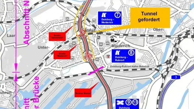 04.04.2024 – Autobahndesaster – Die A 59 auf Duisburger Stadtgebiet ist nördlich des Autobahnkreuzes Duisburg stark überlastet. Deshalb soll der Lückenschluss zwischen der A40 und der A42 von vier auf sechs Fahrbahnen erweitert werden. Jahrelang haben die Autobahnplaner der Duisburger Politik und Bevölkerung einen Tunnel versprochen. Der neue, insgesamt gut 6 km lange Autobahnabschnitt im Bereich des Stadtteils Mittelmeiderich sollte in Form eines 1,5 km langen Tunnels entstehen. Das war für die Duisburger Grundlage für die Zustimmung zum Ausbau. Denn die erweiterten Fahrbahnen rücken für die Menschen in unerträglicher Weise an die Wohn- und Gewerbegebäude ihrer Stadtteile heran.