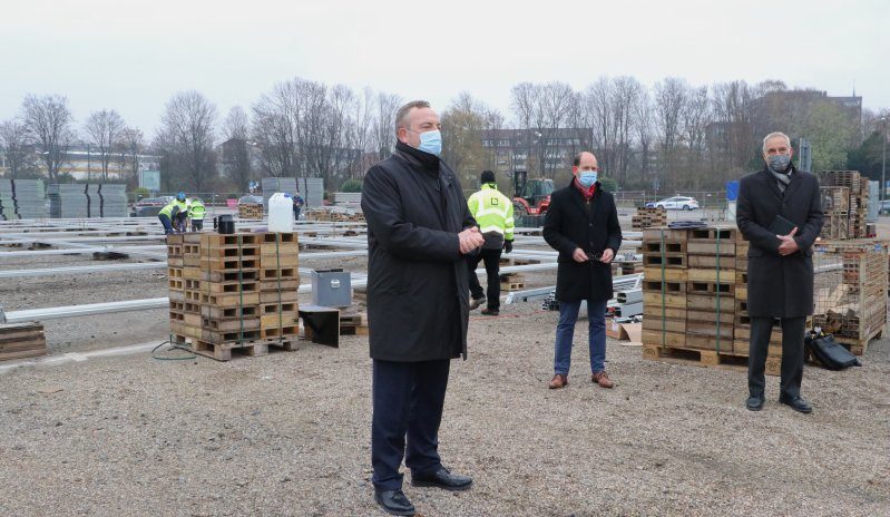 30.11.2020 – Impfzentrum im Kreis – In der letzten Woche wurde die Planung für das Impfzentrum des Kreises Recklinghausen abgeschlossen, am Montag, 30. November, begann der Aufbau der Leichtbauhalle auf dem Konrad-Adenauer-Platz in Recklinghausen. „Wir errichten hier eines der größten Impfzentren in Nordrhein-Westfalen, das bis zum 15. Dezember betriebsbereit sein soll. Unser Ziel ist, dort pro Tag rund 2000 Impfungen durchführen zu können“, sagte Landrat Bodo Klimpel bei einem Ortstermin am Montagnachmittag.