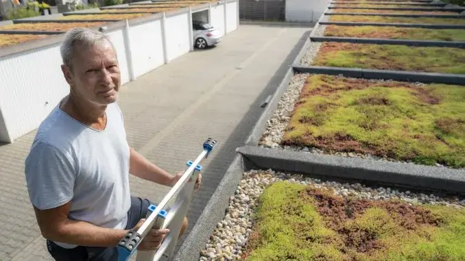 Gladbeck – 16.09.2025 – Garagendächer – Bei Hitze wie in diesem Sommer bleibt’s innen deutlich kühler und schöner sieht es allemal aus: Jürgen Kleine-Natrop hat mit seinen HausnachbarInnen über 200 Quadratmeter Garagendächer begrünt und ist von den Vorteilen überzeugt. Emschergenossenschaft/Lippeverband haben die Dachbegrünung mit 10.000 Euro bezuschusst. In der Region gibt es viele solche Dächer, die noch grau sind, deshalb: Förderantrag stellen und ab Förderzusage das Dach bepflanzen – mit Hilfe einer Firma oder in Eigenarbeit.