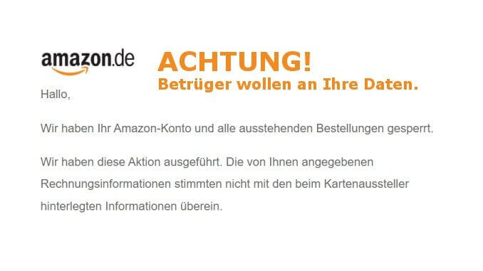 22.12.2021 – Betrugsversuch – Drei Tage vor Weihnachten haben viele Internetnutzer eine „bedrohliche“ eMail bekommen. Im Betreff heißt es „Wegen ungultiger Zahlungsmethode gesperrt“. Und der Text beginnt mit: „Hallo, Wir haben Ihr Amazon-Konto und alle ausstehenden Bestellungen gesperrt.“ Da fällt so manchem zunächst die Maus aus der Hand.