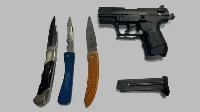 Die Bundespolizisten fesselten den Mann und durchsuchten ihn. Dabei fanden diese in seiner Jackentasche eine vorgespannte, jedoch entladene Schreckschusspistole auf. In der mitgeführten Sporttasche befand sich ein Magazin, welches mit Platzpatronen befüllt war. Zudem stellten die Uniformierten drei Messer, darunter ein Einhandmesser, sicher. Dabei handelt es sich um ein Messer, welches mittels einer, an der Klinge angebrachten Öffnungshilfe einhändig geöffnet und je nach Verschlussmechanismus auch wieder einhändig geschlossen werden kann.