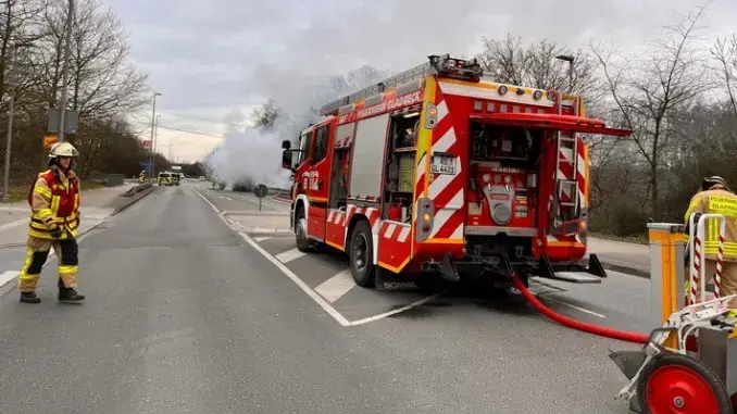 16.03.2023 – Brennender LKW – Heute, am 16.03.2023 hatte die Feuerwehr Gladbeck gegen 13.20 Uhr einen Einsatz in Ellinghorst. Sie musste zu einem LKW-Brand auf der Beisenstraße in Höhe der Autobahn 2. Vor Ort stellte sich heraus, dass es sich um einen Saugwagen eines Straßen-, bzw. Kanalreinigungsunternehmens handelte, welcher in Vollbrand stand.