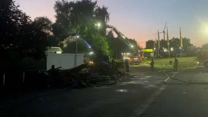 Aufgrund der Dachstruktur und dem verwendeten Dämmmaterial war mit dem System aber ein ausreichender Löscherfolg nicht abzusehen. Deshalb trug das unterstützende THW das gesamte Dach ab. Diese Maßnahme brachte dann den gewünschten Erfolg, weshalb der sehr aufwendige Einsatz nach rund zehn Stunden erfolgreich beendet werden konnte. An dem Einsatz waren von Feuerwehr, Rettungsdienst und THW rund 100 Einsatzkräfte mit etwa 30 Fahrzeugen beteiligt. Menschen verletzten sich bei dem Brand glücklicherweise nicht.