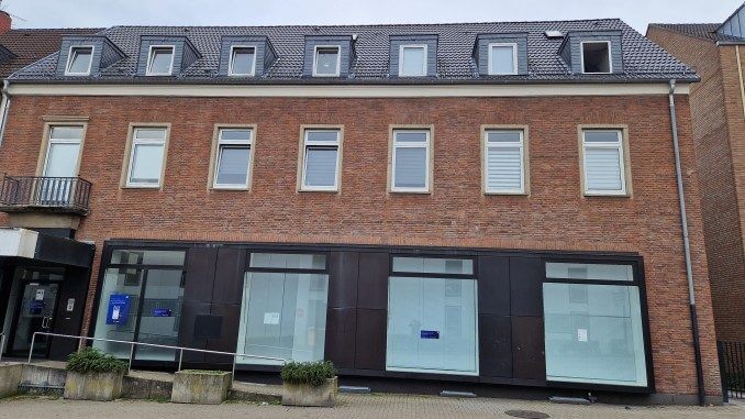 „Das Ladenlokal hat im Erdgeschoss 358 qm und im Kellergeschoss 171 qm Nutzfläche. Bis zum 1.11.2021 ist die Deutsche Bank Mieter. Im Hof befinden sich 9 PKW-Stellplätze. Im Keller befinden sich Schließfächer und ein Tresorraum. Beheizt wird mit Fernwärme. Geeignet sind die Räume für Physiotherapeuten, Rechtsanwälte, Bürogemeinschaften, Planungsbüros, Ärzte und viele mehr. Schnelles Internet ist vorhanden.“, heißt es auf einem DIN A4-Zettel in einem der Schaufenster.