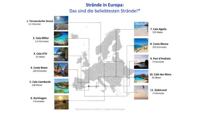 Platz 1: Timmendorfer Strand! Der 6,5 Kilometer lange Sandstrand an der Ostsee sichert sich mit 165.000 monatlichen Google-Suchanfragen den ersten Platz der beliebtesten Strände Europas.