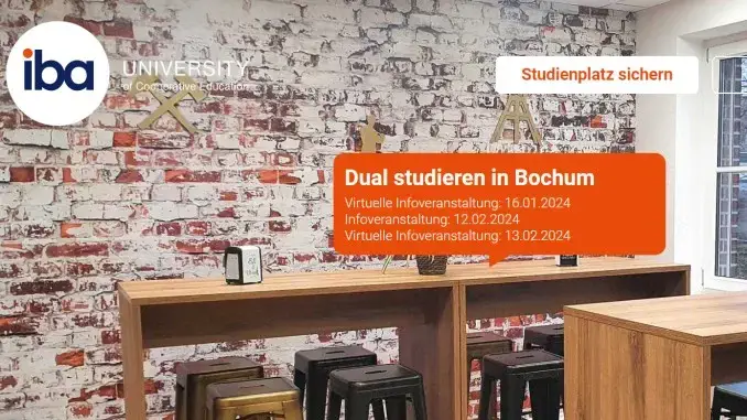 Ort: iba – Internationale Berufsakademie, Campus Bochum, Universitätsstraße 125 (1. OG), 44789 Bochum; https://www.ibadual.com/Bochum