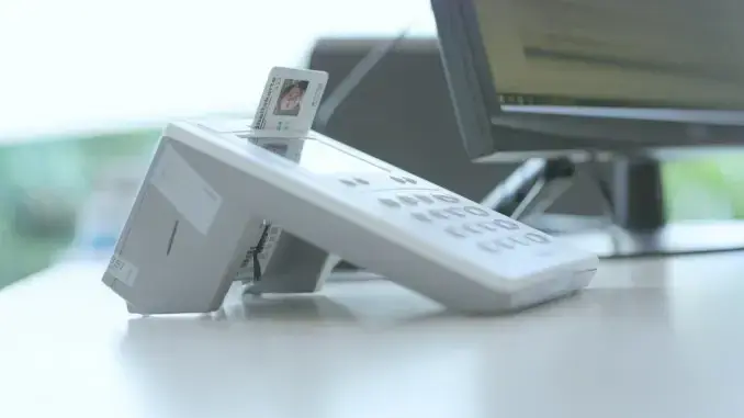 > Beispiel elektronische Gesundheitskarte: Nach dem Einstecken der eGK in das Kartenlesegerät der Apotheke kann diese das E-Rezept aus dem Fachdienst der gematik abrufen.