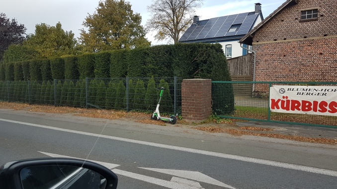 Den ersten Satz dieses Werbetextes kann man wohl uneingeschränkt unterschreiben. Unser Stadtbild wird sich nachhaltig verändern. Gleich nach der Stadtgrenze kann man das schon jetzt sehen. An der Dorstener Straße in Kirchhellen, wenige Meter vor der Kreuzung zur Feldhausener Straße, steht seit etwa 14 Tagen ein verlassener E-Scooter rum. (siehe Foto oben)