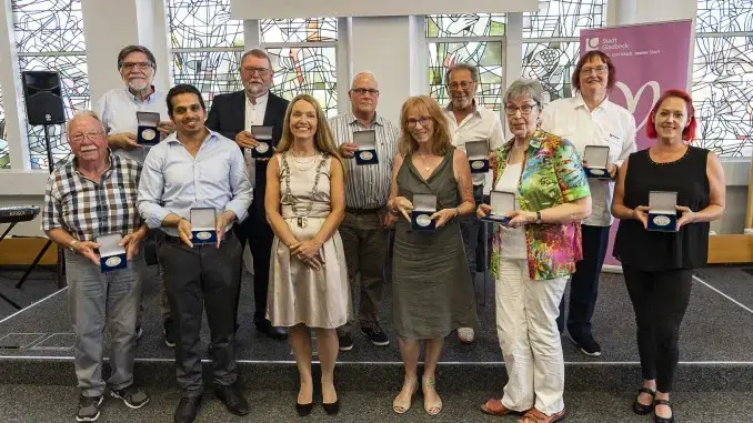 20.06.2023 – Ehrenplaketten – Viele Millionen Menschen sind in Deutschland in einem Ehrenamt tätig. Sie engagieren sich auf diese Weise in ihrer Freizeit für das Gemeinwohl der Gesellschaft – und das auf unterschiedlichste Weise. Eine kleine Zahl derer ehrte die Bürgermeisterin am Montagnachmittag im Ratssaal des Alten Rathauses. Sie überreichte Ehrenplaketten der Stadt Gladbeck, der höchsten Auszeichnung, die die Stadt Gladbeck vergibt. „Das Ehrenamt ist eine starke Stütze der Gesellschaft. Es trägt dazu bei, das gesellschaftliche Leben zu gestalten und in der uns bekannten Form zu ermöglichen. Zum Glück gibt es in unserer Stadt viele Menschen, die nicht nur auf sich selbst schauen, sondern überlegen, wie sie anderen helfen können“. So Bürgermeisterin Bettina Weist und dankte auch im Namen von Rat und Verwaltung.