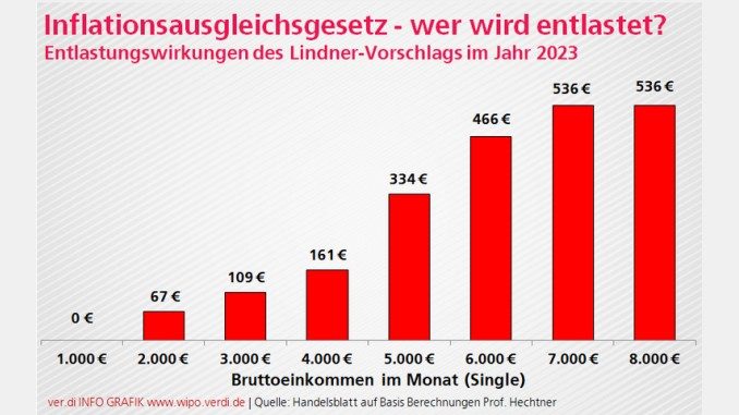 Lindner würde Personen mit Bruttomonatseinkommen über 6000 Euro 2023 mit über 500 Euro entlasten und 2024 mit weiteren über 260 Euro. Paare mit zusammen über 12.000 Euro sparen das Doppelte. Bei 3000 Euro brutto im Monat ist die Entlastung nur ein Drittel so hoch, bei 2000 Euro nur ein Fünftel. Wer so wenig Geld hat, dass keine Einkommensteuer anfällt, hat gar nichts davon.
