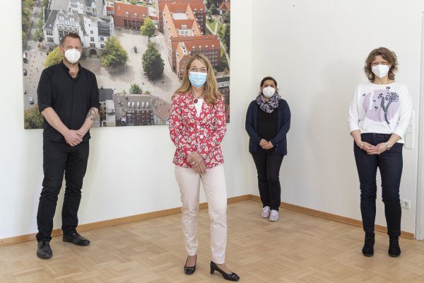 Anlage Fotodatei: PM-240, v. l. Markus Landwehr, Bürgermeisterin Bettina Weist, Sonay Gündogan und Sarah Kimmeskamp bei einem gemeinsamen Treffen zum Demokratieprojekt.