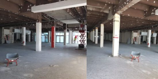 11.06.2020 – Die unteren zwei Ebenen im Glückaufcenter am Gladbecker Marktplatz sind in den Rohbauzustand versetzt worden. (siehe Foto) Seit Jahresbeginn wurden Lüftungen, Zwischenwände, Sanitär- und Elektroinstallationen demontiert: das Ergebnis ist der Rohbauzustand.