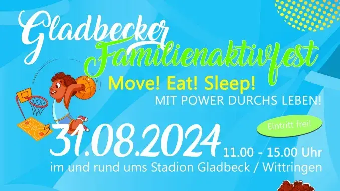 Gladbeck – 16.08.2024 – Familienaktivfest – Das größte Netzwerk dieser Stadt feiert jährlich mit den Gladbecker Familien ein großes Fest, um miteinander mit Spiel und Spaß die Erziehung und Bildung der Kinder und Jugendlichen zu stärken. Erstmals wird am Samstag, 31. August, von 11 bis 15 Uhr das Gladbecker Stadion der Veranstaltungsort sein. Denn unter dem Motto „Move! Eat! Sleep! Mit Power durchs Leben!“ geht es um wichtige Themen wie genügend Bewegung, gutes Essen und ausreichend Schlaf, die Klein und Groß für ein gesundes Leben brauchen.