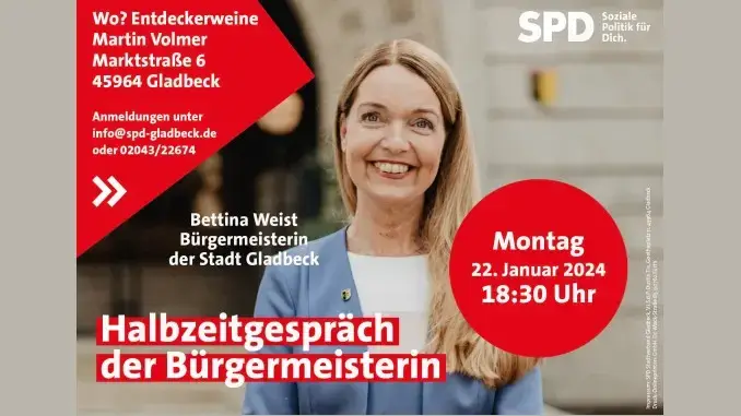 Am 22.01.2024, um 18:30 Uhr, lädt Bettina Weist alle Bürgerinnen und Bürger der Stadt sowie die Vertreterinnen und Vertreter der Presse herzlich zum Halbzeitgespräch in die Räumlichkeiten des Weinhandels “Entdeckerweine”, Marktstraße 6, Gladbeck, ein.