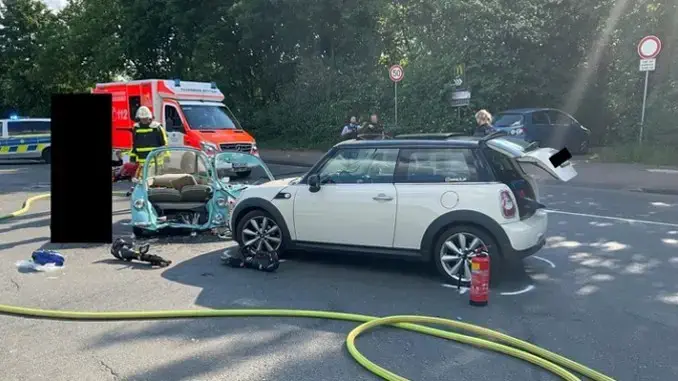 14.05.2024 – Heinkel Kabinenroller – Gegen 17:15 Uhr kam es in einem Kreuzungsbereich an der Beisenstraße in Gladbeck zu einem folgeschweren Verkehrsunfall zwischen einem PKW und einem Heinkel Kabinenroller. Der im Abbiegevorgang befindliche PKW stieß mit dem in Richtung Gladbeck fahrenden Oldtimer zusammen. Bei dem Zusammenstoß haben sich beide Fahrer verletzt. Die Wucht des Aufpralls sorgte bei dem Kabinenroller dafür, dass der Fahrer in seinem Fahrzeug schwerverletzt eingesperrt wurde.