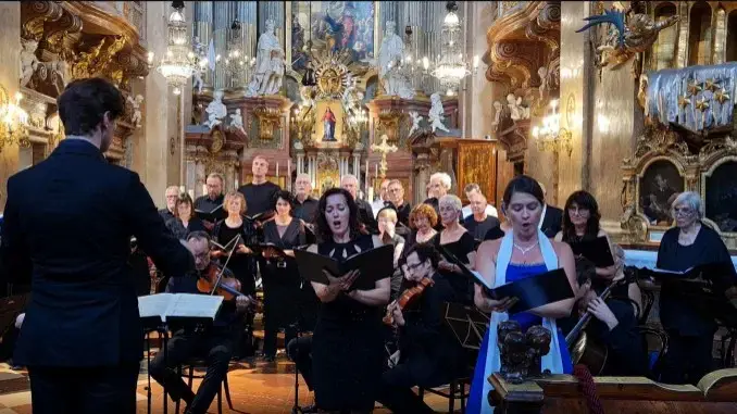 Nach einer intensiven Probenphase führte das Ensemble gemeinsam mit dem Wiener Chor des „Beethoven plus Festivals“ in den prunkvollen Gemäuern der zentral gelegenen barocken Peterskirche das „Gloria“ von Antonio Vivaldi und die zeitgenössische Kantate „Miserrere“ von Marina Reshetova auf. Begleitet haben die SängerInnen die Musikerinnen und Musikern des „United European Orchesters“. Als Gesangssolisten brillierten die beiden Sopranistinnen Diana Petrova Darnea und Christiane Marie Riedel.