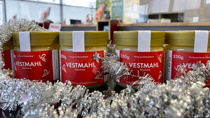 03.12.2021 – Honig – Weil’s so lecker war: Nach dem großen Erfolg bei der Premiere im vergangenen Jahr bietet die Vestische auch 2021 wieder den hauseigenen „Vestmahl“-Honig in ihren KundenCentern an – diesmal in einer cremigen Variante. Imker Christian Kolbe hat insgesamt 450 Kilogramm in jeweils 600 Gläser à 500 und 250 Gramm gefüllt.