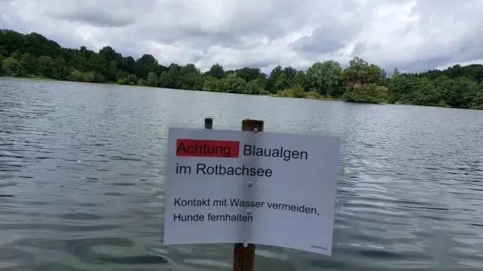 Gladbeck – 07.07.2025 – Hundebesitzer – Der Verdacht auf Blaualgen im Rotbachsee hat sich bestätigt. Der Lippeverband hat rund um den Rotbachsee Warnschilder aufgestellt. Der Wasserwirtschaftsverband warnt SpaziergängerInnen vor Kontakt mit dem Seewasser.