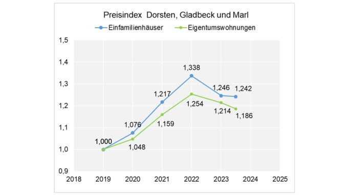 24.07.2024 – Immobilienmarkt – „Das Preisniveau des örtlichen Immobilienmarktes zeigt sich im ersten Halbjahr 2024 weitgehend stabil,“ berichtet Dörthe Schmidt, Vorsitzende des gemeinsamen Gutachterausschusses für Grundstückswerte in den Städten Dorsten, Gladbeck und Marl. Im Gegensatz zum überregionalen Deutschland-Vergleich (Quelle: destatis) befinden sich die Preise für Ein- und Zweifamilienhäuser immer noch auf dem gleichen Niveau wie 2023, lediglich Eigentumswohnungen wurden im Mittel rund 3 % günstiger gehandelt.