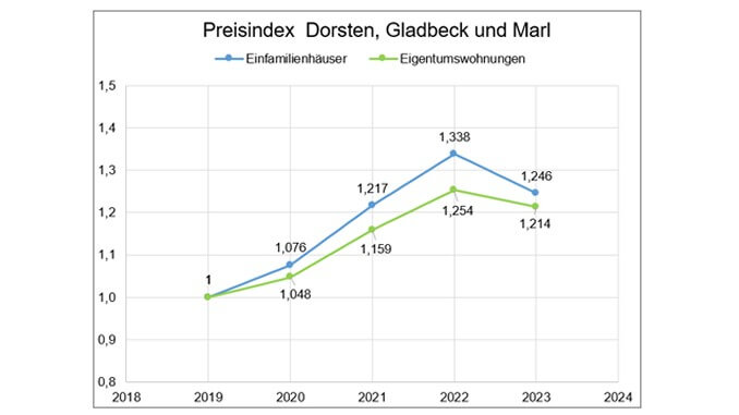16.02.2024 – Immobilienmarkt – „Der stetige Aufwärtstrend für Wohnimmobilien brach 2023 erstmals über ein ganzes Kalenderjahr“, berichtet Dörthe Schmidt. Sie ist die Vorsitzende des Gutachterausschusses für Grundstückswerte in den Städten Dorsten, Gladbeck und Marl. Statistische Auswertungen der Immobilienverkäufe zeigen im Jahresvergleich die erwartete rückläufige Entwicklung. So sanken die 2023er Preise für Ein- und Zweifamilienhäuser in Dorsten, Gladbeck und Marl im Vergleich zum Vorjahr im Durchschnitt um 9 Prozent und die Preise für Eigentumswohnungen um 4 Prozent.