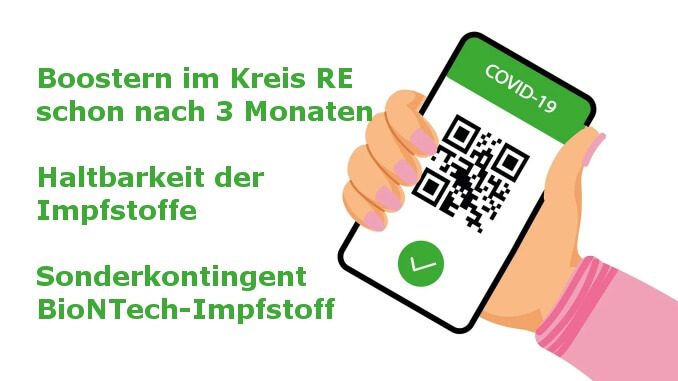 23.12.2021 – Impfen im Kreis RE – Das Land NRW folgt der Empfehlung der Ständigen Impfkommission (STIKO): Booster-Impfungen sind ab sofort in den kommunalen Impfstellen und bei mobilen Impfaktionen im Kreis Recklinghausen früher möglich als bisher. Wessen vollständige Impfung mindestens drei Monate zurückliegt, kann seinen Impfschutz ab sofort mit einem mRNA-Impfstoff auffrischen lassen. Das gilt für alle Personen ab 18 Jahren.