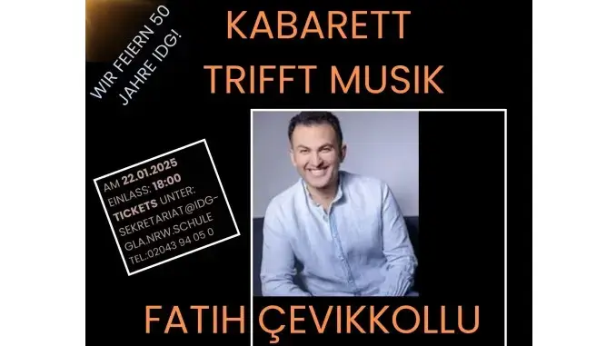 Am 22.01.2025 ab 18.30 Uhr (Einlass: 18 Uhr) führt Fathi Cevikkollu (Kabarettist und Schauspieler bekannt z.B. durch Alles Atze · Pension Schmidt · Spezialeinsatz · GSG 9…) zusammen mit der Schulband unter der Leitung von Herrn Bischoff einen bunten Abend durch.