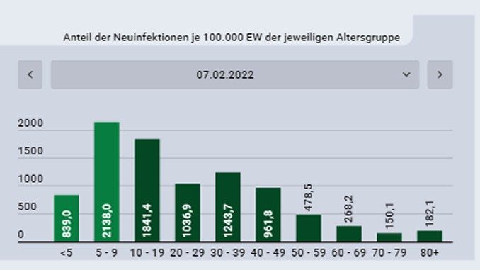Mit einem Wert von 2.138 für die 7-Tage-Inzidenz liegt die Altersgruppe von 5-9 Jahre, also das Grundschulalter, wie bisher an der Spitze. Gefolgt von den 10-19-Jährigen mit dem Wert 1.841. Glücklicherweise hat Corona bislang bei jungen Menschen unter 20 Jahren nicht zu Todesfällen geführt. In höheren Altersstufen sieht es leider anders aus. Insgesamt sind im Kreis RE 1.139 Personen a oder mit Corona verstorben. 174 davon waren Gladbecker.