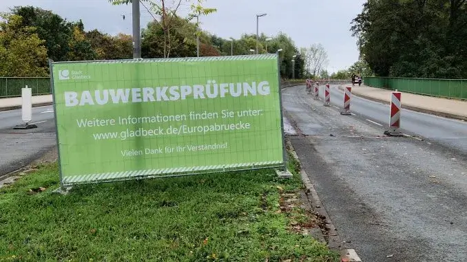 Gladbeck – 15.10.2025 – „Die Europabrücke wurde in den vergangenen Monaten einer intensiven Hauptprüfung nach DIN 1076 unterzogen. Diese regelmäßige Bauwerksprüfung ist weitgehend abgeschlossen. Dabei wurden keine gravierenden neuen Schäden festgestellt. Die Brücke befindet sich in einem altersgemäßen Zustand“, antwortet die Stadt Gladbeck auf eine Anfrage der Neuen Gladbecker Zeitung.