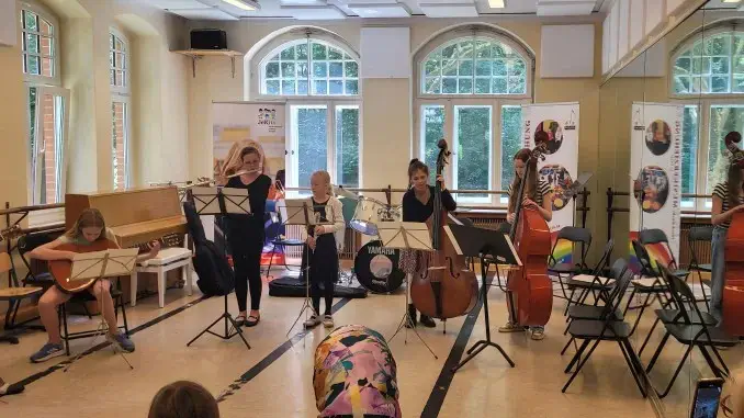 28.06.2024 – Kammermusiktag – Wer sich am vergangenen Wochenende der grün umschlossen Siedlung am Bernskamp näherte, konnte bereits von weitem den vielen schönen Klängen lauschen, die vom historischen Gebäude der Musikschule der Stadt Gladbeck ausgingen. Über 200 SchülerInnen kamen in 52 Formationen zusammen, um in vielen kleinen Konzerten beim Kammermusiktag im und rund um das Gebäude der Gladbecker Musikschule gemeinsam zu musizieren. Von Duos, Trios über Quintette und Septette bis hin zum Kammerorchester waren alle Instrumental- und Vokalensembles jeglicher Größen und Konstellationen vertreten.