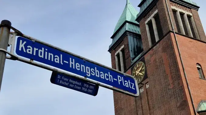 Auch der Kreisverkehr vor der Kirche trägt den Namen Kardinal-Hengsbach-Platz. Eventuell ist die Stadt Gladbeck ja schneller als die Kirche. Der CDU-Oberbürgermeister von Essen hat die Zeichen der Zeit jedenfalls erkannt und will den Platz dort umbenennen lassen.