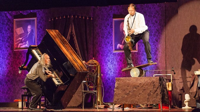 Gut zwei Dutzend Instrumente haben die Musiker für das Gladbecker Publikum im Gepäck. Damit verwandeln sie im Handumdrehen jedes Theater in eine tosende Arena größter Heiterkeit.