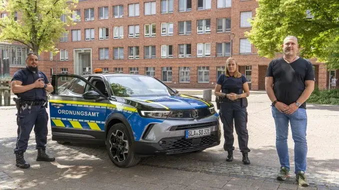 12.07.2023 – Der Kommunale Ordnungsdienst (KOD) ist mit einem neuen Fahrzeug im Stadtgebiet im Einsatz, zudem erhält das Team personelle Verstärkung. Ab sofort ergänzt der „Opel Mokka E“ als erstes Elektrofahrzeug die Fahrzeugflotte des KOD, seit Mai verstärken zudem Nina Gröning und Rashid Didi das Team.