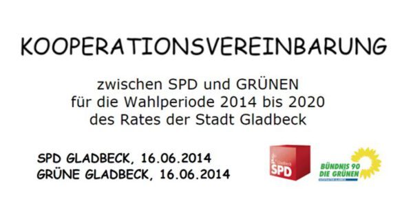 09.07.2020 – Das ist Kommunalpolitik: Nach der Kommunalwahl im Jahre 2014 schlossen SPD und Grüne eine Vereinbarung um ihre Zusammenarbeit im Rat der Stadt Gladbeck fortzuführen. Bemerkenswert ist der Passus zum Ausbau der B224 zur A52 und die Anerkennung des Ergebnisses des Ratsbürgerentscheides, bei dem eine deutliche Mehrheit der Gladbecker gegen den Ausbau stimmte.