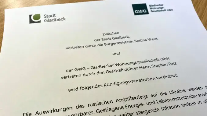 22.11.2022 – Kündigungsmoratorium – Die Auswirkungen des Ukraine-Krieges sind auch in Gladbeck spürbar: Gestiegene Energie- und Lebensmittelpreise und eine weiter steigende Inflation wirken in alle Bereiche der Gesellschaft. Deshalb vereinbarten die Gladbecker Wohnungsgesellschaft mbH (GWG) und die Stadt Gladbeck ein Kündigungsmoratorium. Es soll MieterInnen vor dem Verlust ihrer Wohnung schützen, wenn aufgrund von gestiegenen Nebenkosten Zahlungsrückstände entstehen. Bürgermeisterin Bettina Weist und GWG-Geschäftsführer Stephan Patz unterzeichneten in dieser Woche eine entsprechende Vereinbarung.
