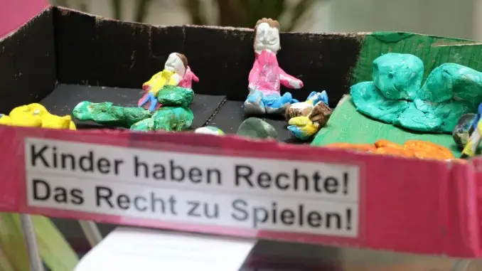 Die Ausstellung zeigt, welche Rechte Kinder haben und welche den Grundschülerinnen und -schülern besonders wichtig sind. Dabei sei übrigens der künstlerische Ausdruck von Inhalten selbst ein Recht der UN-Kinderrechtskonvention, wie Lotte Schelleckes vom KI weiß: „In Artikel 13 heißt es sinngemäß, dass Kinder das Recht auf freie Meinungsäußerung haben. Dieses Recht schließt die Freiheit ein, Informationen und Meinungen jeder Art in Wort, Schrift oder auch durch Kunstwerke weiterzugeben.“