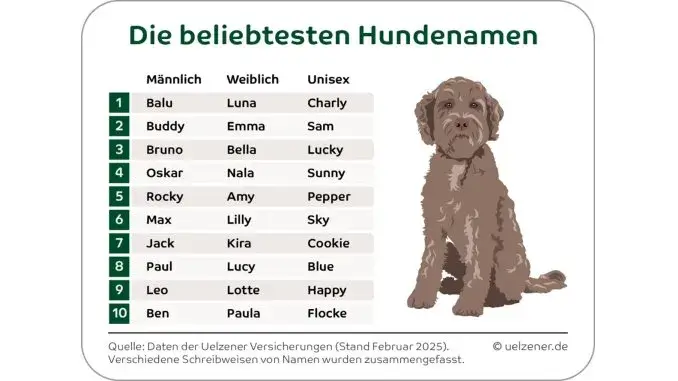 Gladbeck – 06.05.2025 – Luna Balu Pommes – Die Uelzener Versicherungen, Deutschlands führender Spezialist für Tierversicherungen, haben rund 360.000 registrierte Hundenamen ausgewertet und daraus eine Rangliste der Favoriten erstellt. Unterschiedliche Schreibweisen und Varianten wurden dabei jeweils zusammengefasst.