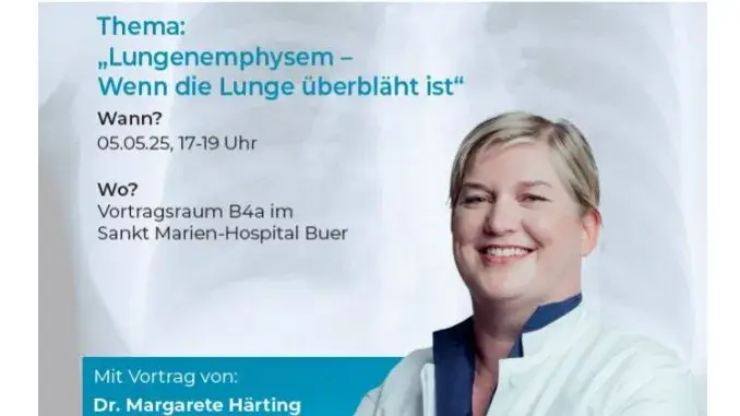 Zusammen mit der Klinik für Thoraxchirurgie des Marienhospitals Gelsenkirchen am Montag, 5. Mai 2025 findet die Veranstaltung im Marien-Hospital-Buer statt. Es referiert Dr. Margarete Härting, Leitende Ärztin der Klinik für Thoraxchirurgie zum Thema COPD mit Lungenemphysem.
