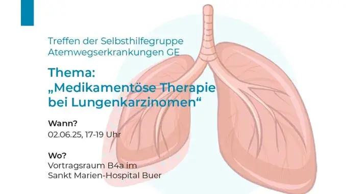 Gladbeck – 22.05.2025 – Lungenkarzinomen – Die Selbsthilfegruppe „Atemwegserkrankungen Gelsenkirchen“ lädt am Montag, 2. Juni 2025 Betroffene und Interessierte zum Treffen rund um das Thema „Medikamentöse Therapie bei Lungenkarzinomen“ ein.