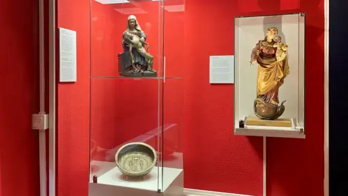 Auch die fein gearbeitete Holzfigur der Muttergottes mit dem Jesuskind aus dem Hochbarock hat einen angemessenen Platz gefunden. In der neuen Vitrine rechts daneben zeigt das Museum die trauernde Maria mit dem toten Jesus auf dem Schoß. Eine Szene aus dem Alten Testament, nämlich der Sündenfall mit Adam und Eva im Paradies, schmückt die „Beckenschlägerschüssel“ aus Messing in derselben Vitrine. Becken ist die im Mittelalter gebräuchliche Bezeichnung für Schüsseln aus Metall, die der Beckenschläger mit einem Hammer auf einem Amboss in die richtige Form schlug. Das Museumsstück ist über 400 Jahre alt und diente vermutlich als Taufschale.