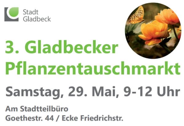 Der dritte Gladbecker Pflanzentauschmarkt wird am 29. Mai stattfinden. Zeit: zwischen 09 und 12 Uhr im Außenbereich vor dem Stadtteilbüro Goethestr. 44 / Ecke Friedrichstraße. Verschiedene Nutz- und Zierpflanzen für den eigenen Balkon und Garten werden zum Tauschen und Mitnehmen bereitgestellt. Hier sind der Vielfalt keine Grenzen gesetzt:
