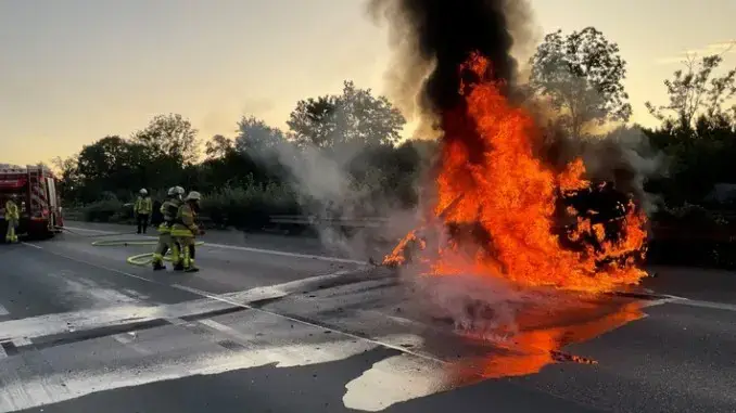 23.08.2023 – PKW-Brand – Um 20:09 Uhr wurde am Dienstagabend die Feuerwehr Gladbeck zu einem PKW-Brand auf die A2 in Fahrtrichtung Oberhausen alarmiert. Das Fahrzeug fing plötzlich an zu brennen und kam im Bereich des Autobahnkreuzes Bottrop auf der Hauptfahrbahn zum Stehen.